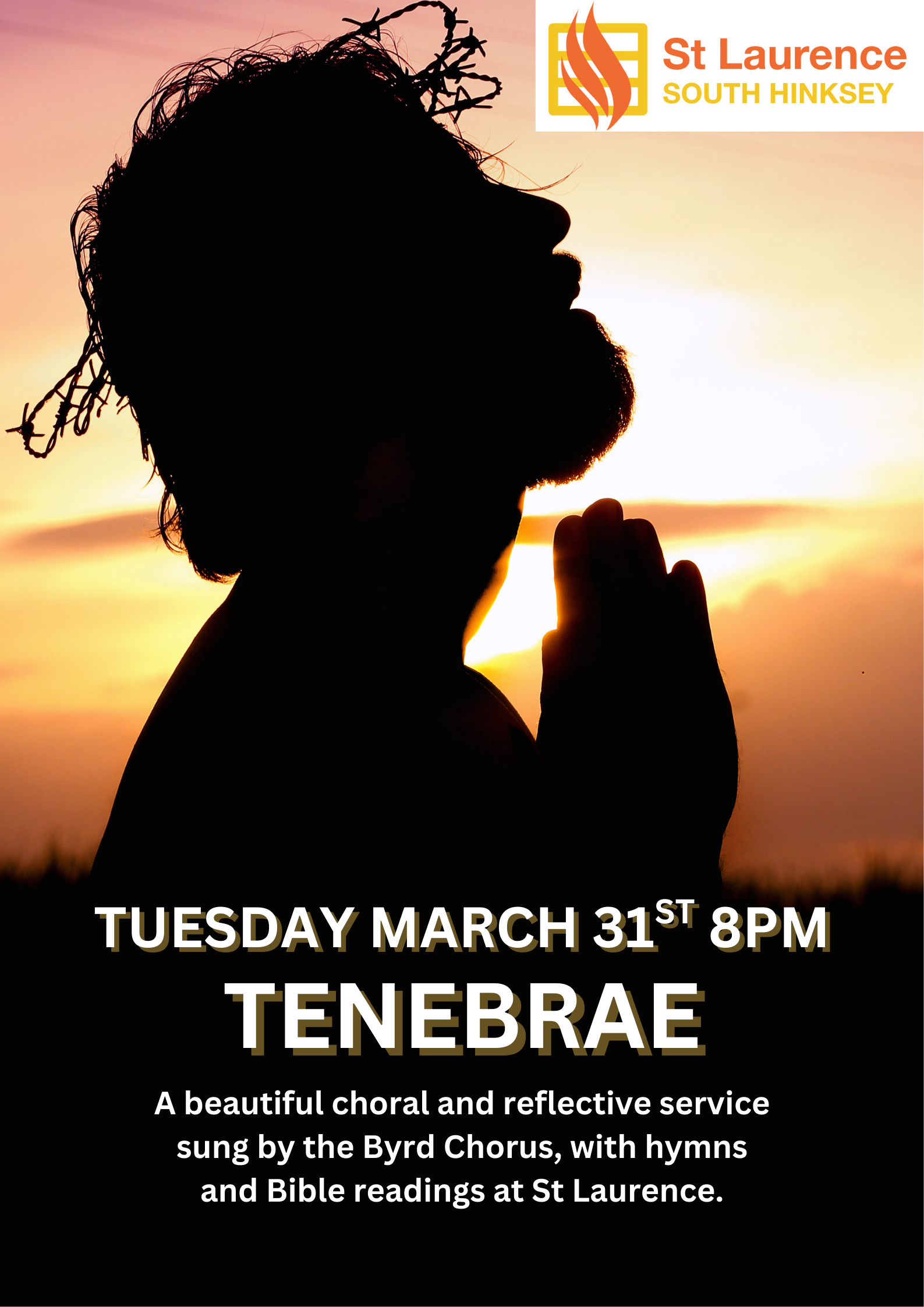 Home calendar - St John New Hinksey & St Laurence South Hinksey Tenebrae on Holy Tuesday Tenebrae on Holy Tuesday + Add to Google Calendar + iCal / Outlook export Date Mar 31 2026 Time 8:00 pm Location St Laurence South Hinksey, Oxford OX1 5AQ Category Homepage - Three Thumbnails Homepage - What's on Share this event